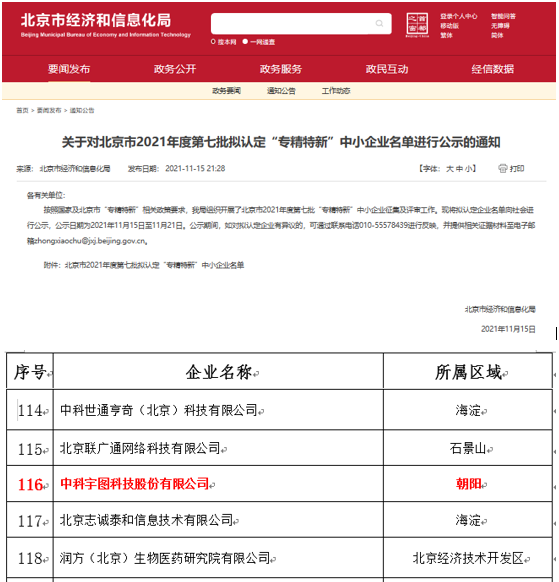 喜報(bào)!中科宇圖成功入選北京市2021年度 “專精特新”中小企業(yè)名單